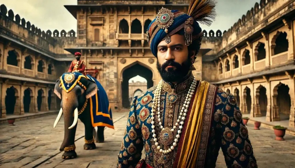 छत्रपति संभाजी महाराज का ऐतिहासिक चित्र, पारंपरिक शाही पोशाक में राजमहल के आंगन में खड़े, पृष्ठभूमि में शाही हाथी।